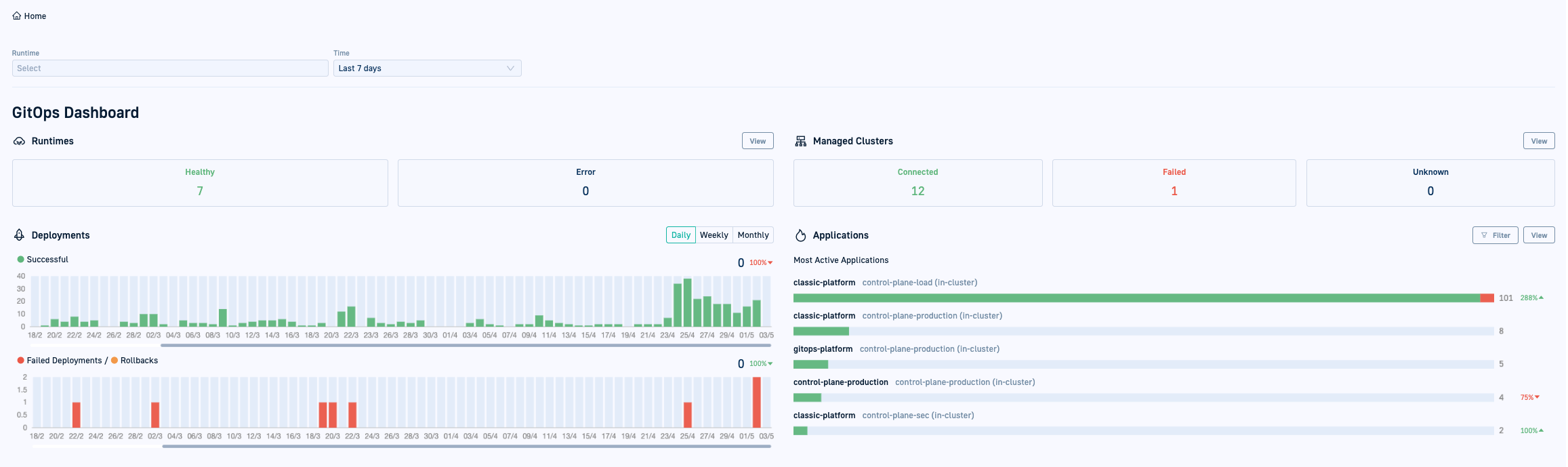 The GitOps Dashboard in the Home dashboard offers a global view of GitOps Runtimes, managed clusters, deployments, and applications. For system-wide visualization in real-time, this is your dashboard of choice in Codefresh.