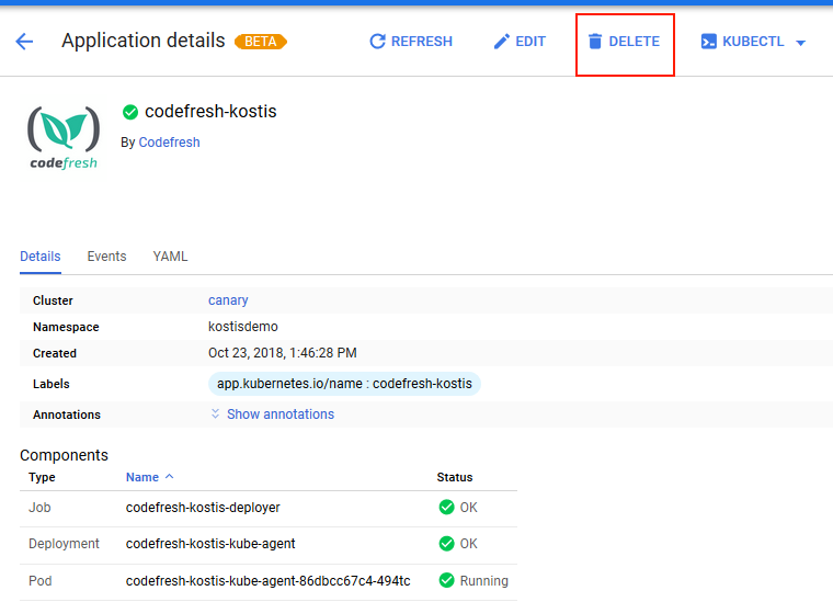 If you want to remove the Codefresh builder from your cluster, navigate to the “Applications” page in the Google Cloud console and click the Delete button.