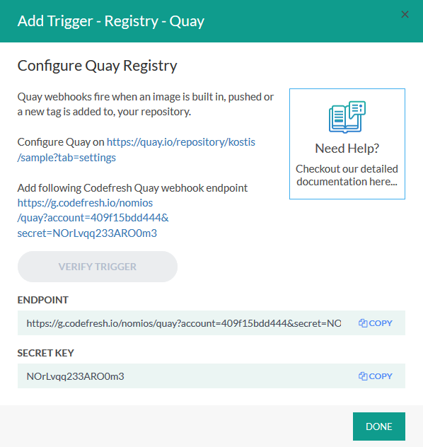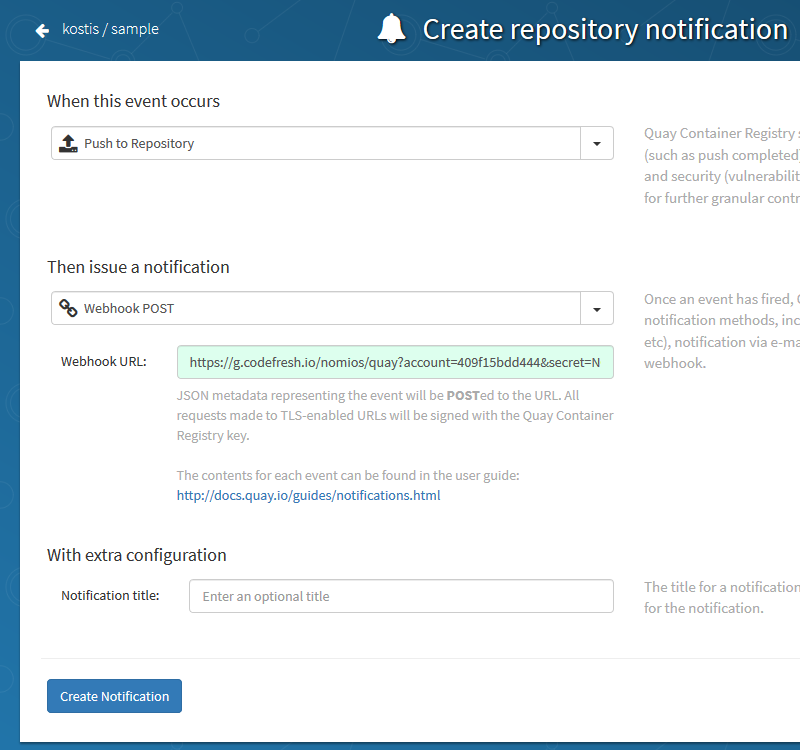 - Creating a new notification in Quay that will use this URL to call Codefresh