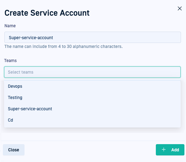 • Edit: Modify the settings of the service account, including adding/removing teams, enabling/disabling admin role.