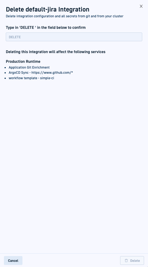 Deleting an integration deletes the integration resource from the Shared Configuration Repository, its secrets, and the CI workflows that