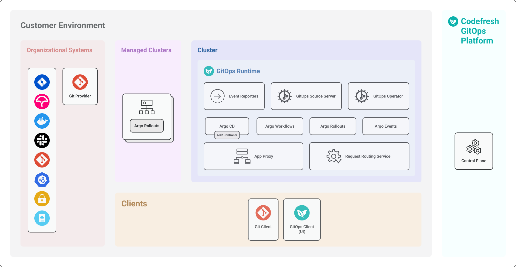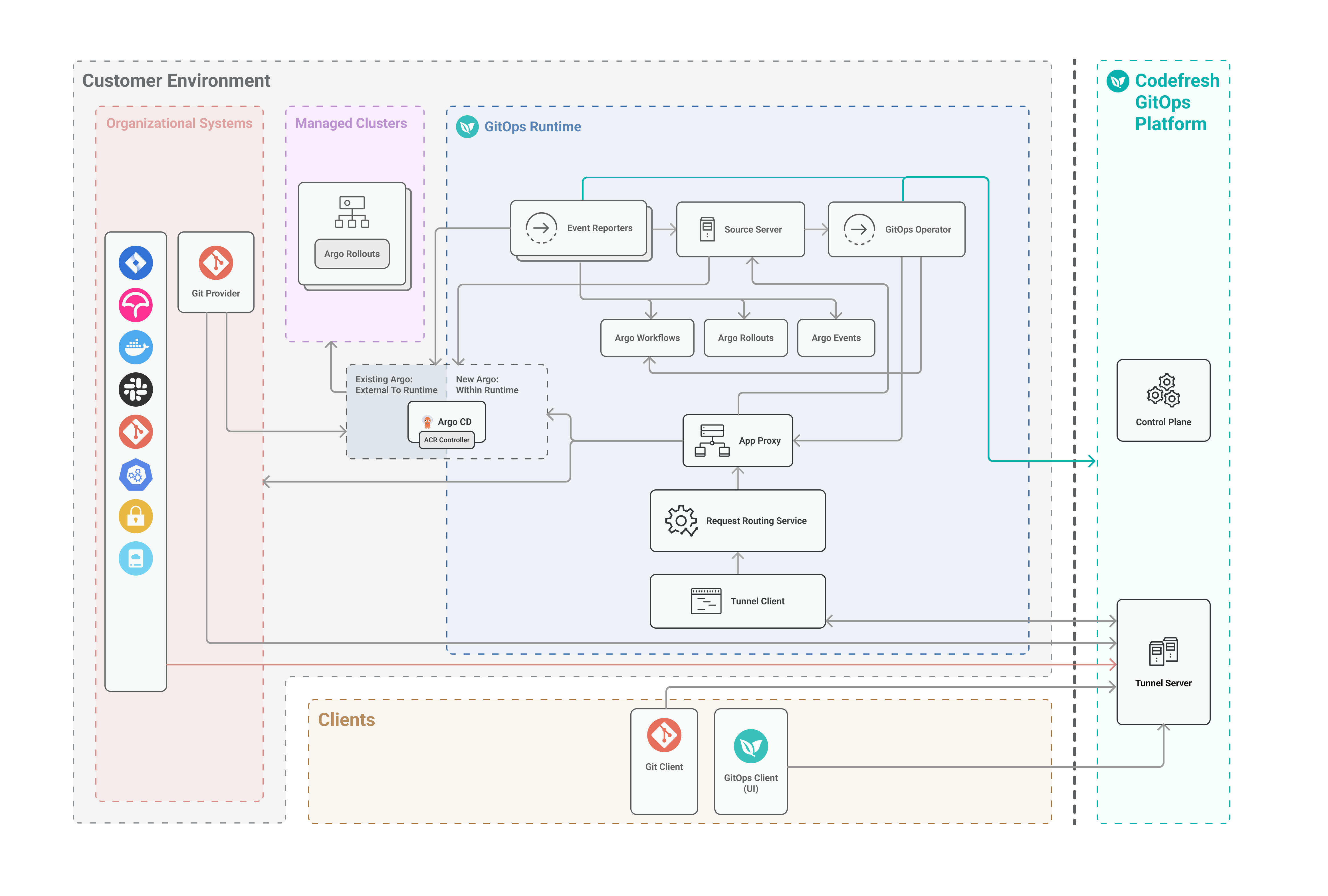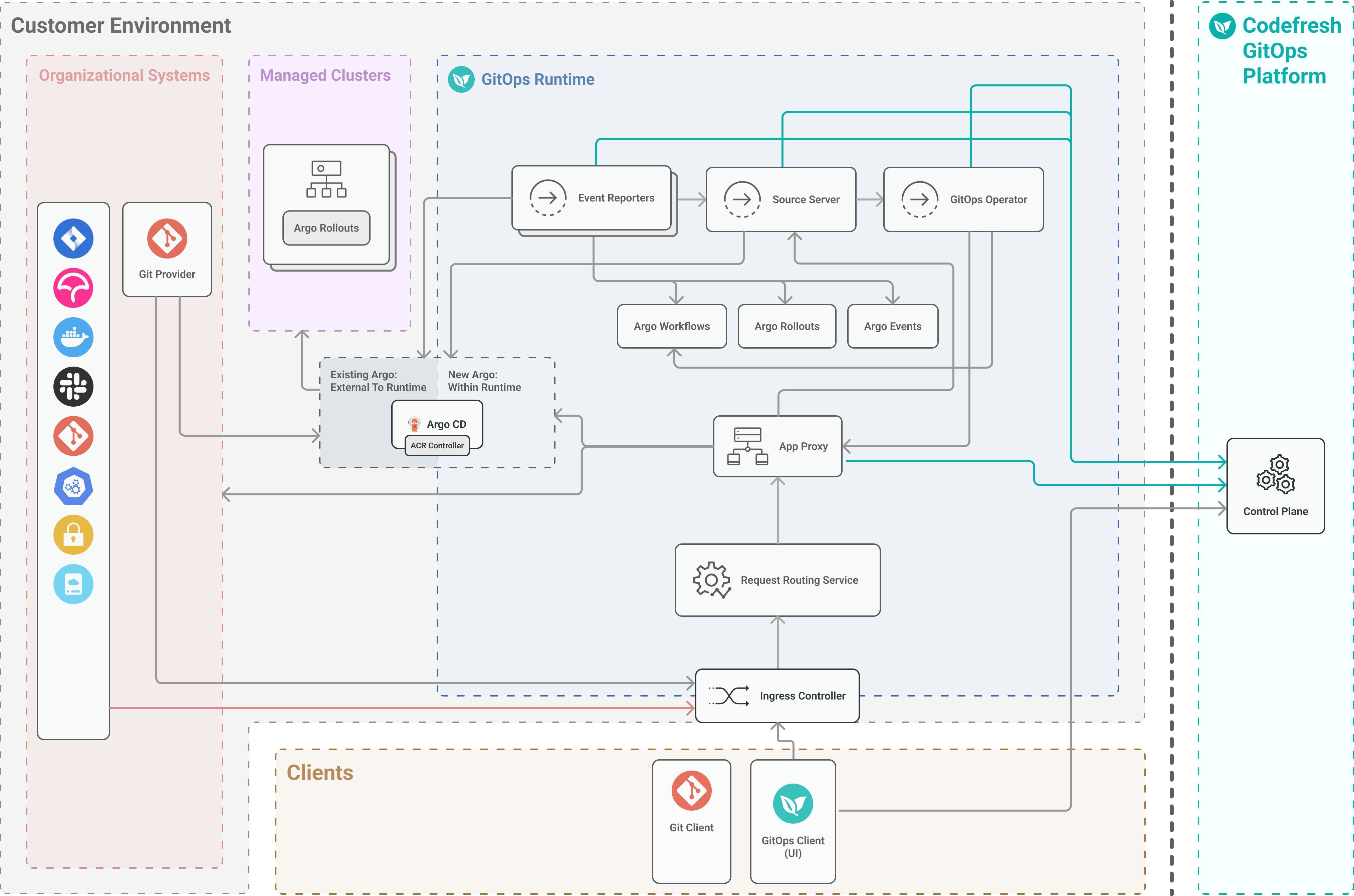The customer environment that communicates with the GitOps Runtime and Codefresh generally includes: