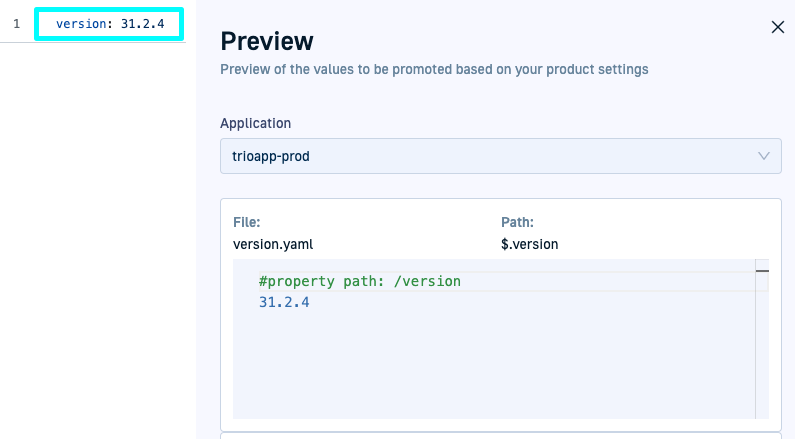 On the left, you can see the YAML manifests, on the right, the previews show how the trio-prod application resolves these values.