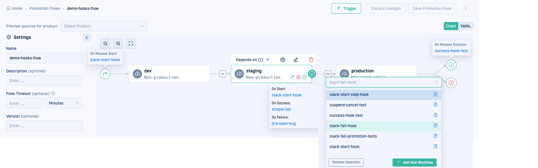 See Assigning promotion hooks in Promotion Flows. For the YAML specifications of promotion hooks when assigned, see Promotion Flow YAML.
