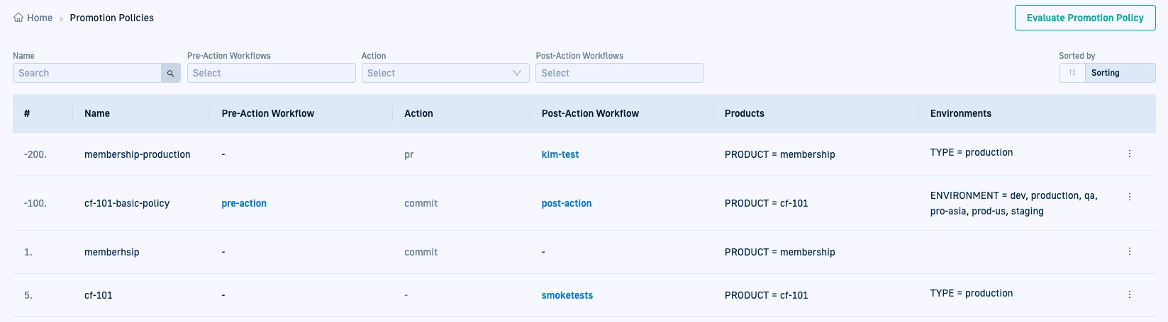 Visualize the policy settings which will be applied to a product-environment pair with Evaluate Promotion Policy option. Not only does this option identify product and environments which do not match existing Promotion Policies, it also identifies misconfigured policies. -
