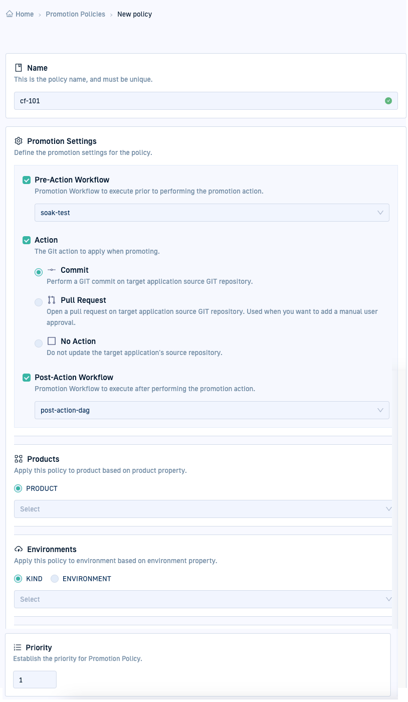 A Promotion Policy combines the Promotion Workflows to run before and after a promotion, the commit or pull request action to use for promotion, and the targets defining the products or environments the policy applies to.