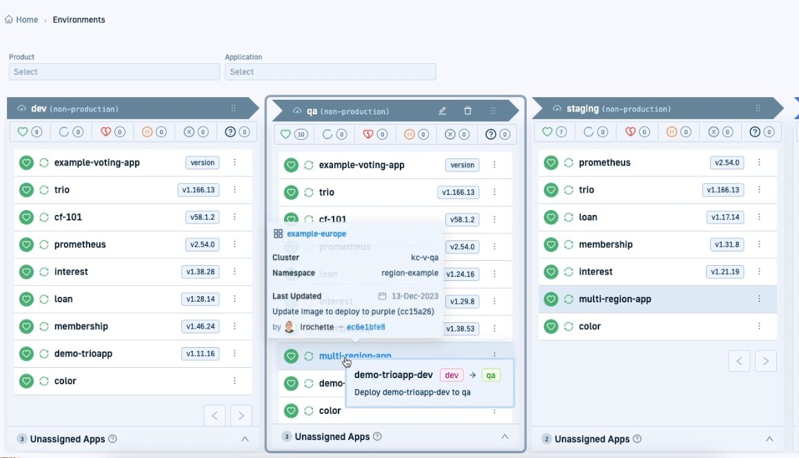 - From the sidebar in the Codefresh UI, select Environments, and then select the environment with the product to promote.