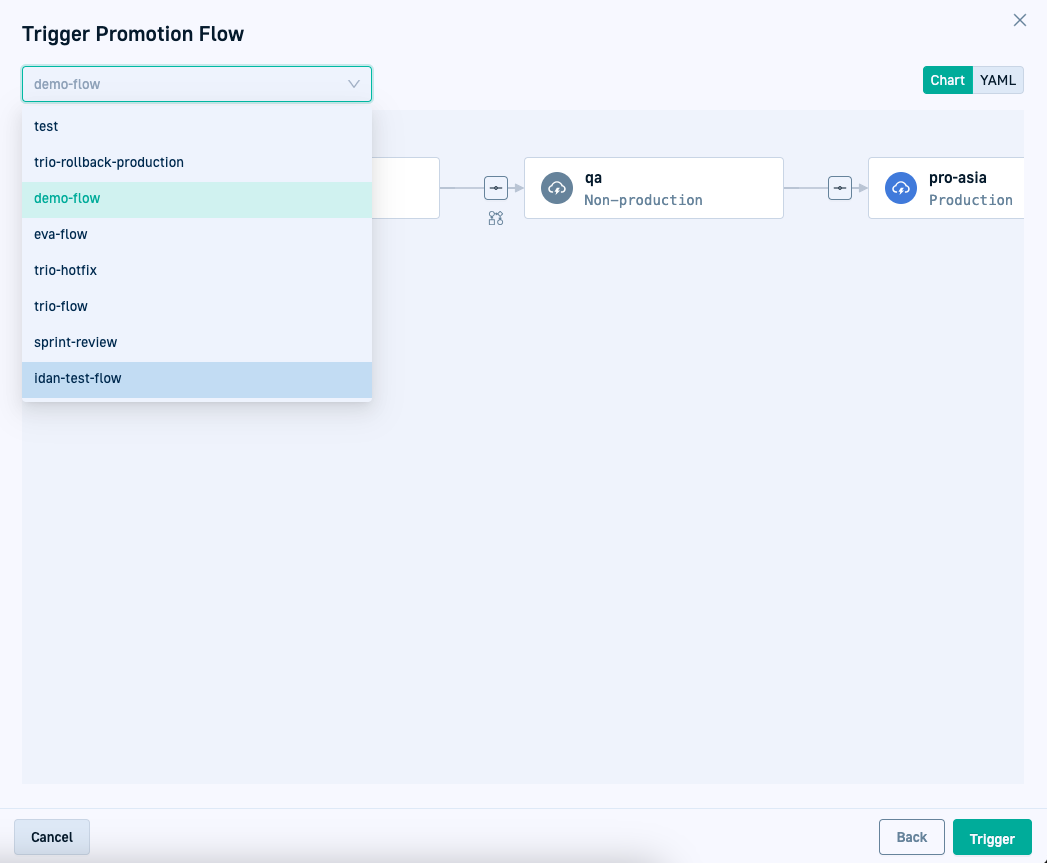 Manually trigger promotion for a product across all environments configured in a predefined Promotion Flow.