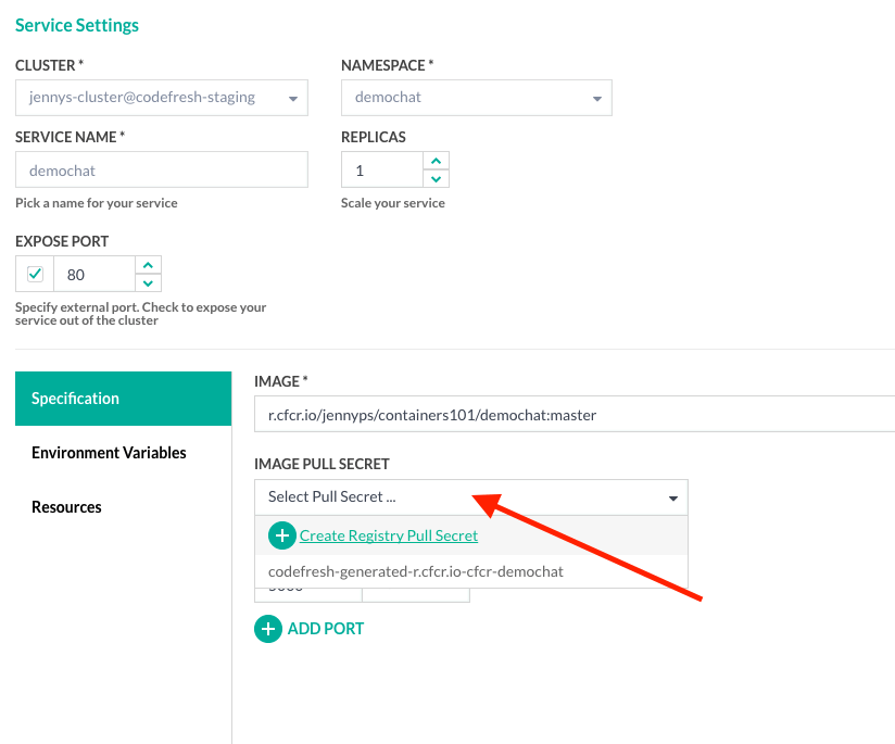 Use the following steps in order to add Image and pull secrets from the connected Docker Registry: