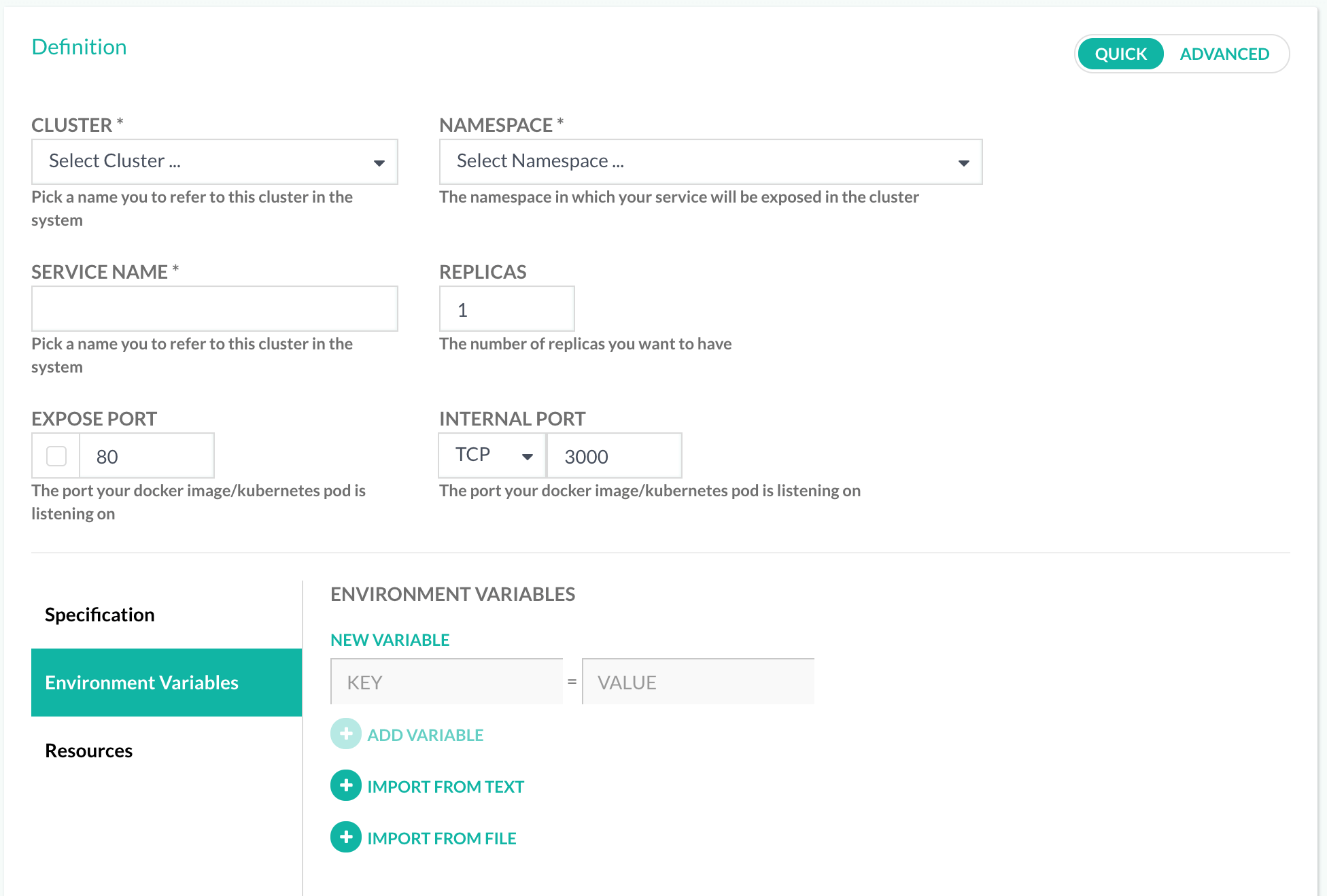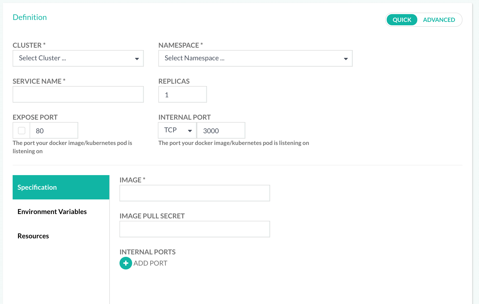 To add a service, click the “Add Service” button on the top or the “plus” button on a specific namespace. Then fill in the details for your new service.