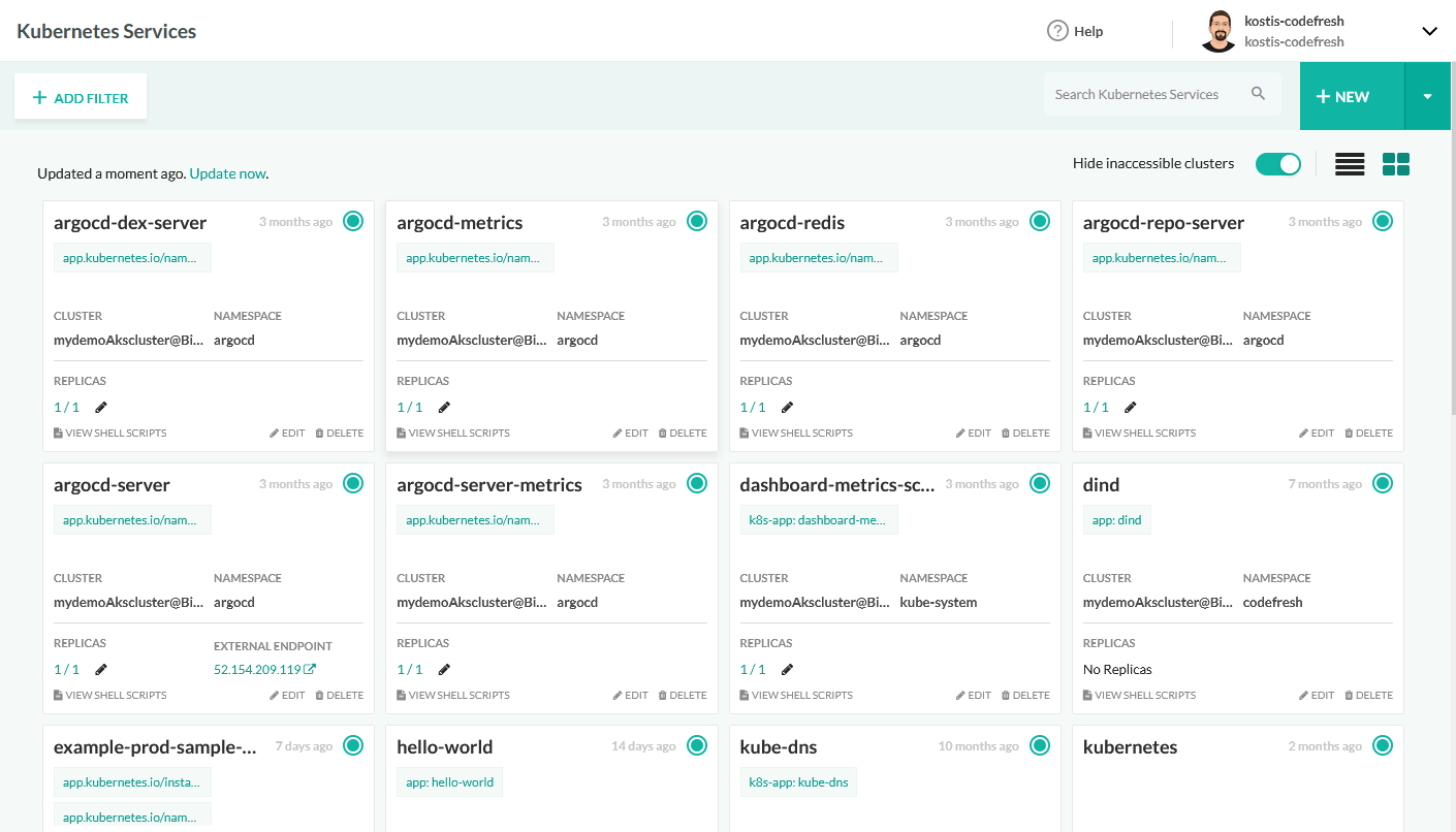 With the graphical dashboard, it is very easy to locate problematic services or deploy new ones quickly. If there are clusters that are not accessible to your user, you can hide them by enabling the Hide inaccessible clusters option at the top right of the window in order to simplify the view.