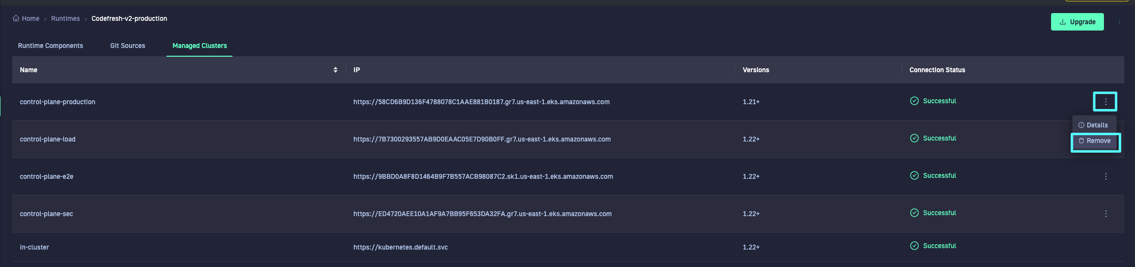 Remove a cluster from the list managed by the GitOps Runtime in the Codefresh UI.