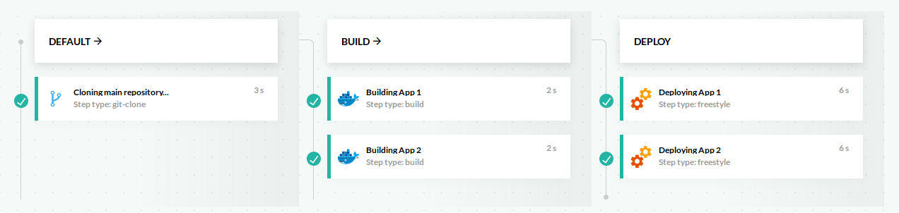 Let’s see a full example. In this pipeline, we will create two Docker images and deploy them on two separate clusters, using custom kubectl commands. We will also use the parallel capability of Codefresh pipelines.