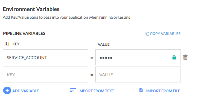Add your service account json as a pipeline variable called SERVICE_ACCOUNT. The content of this variable will be used