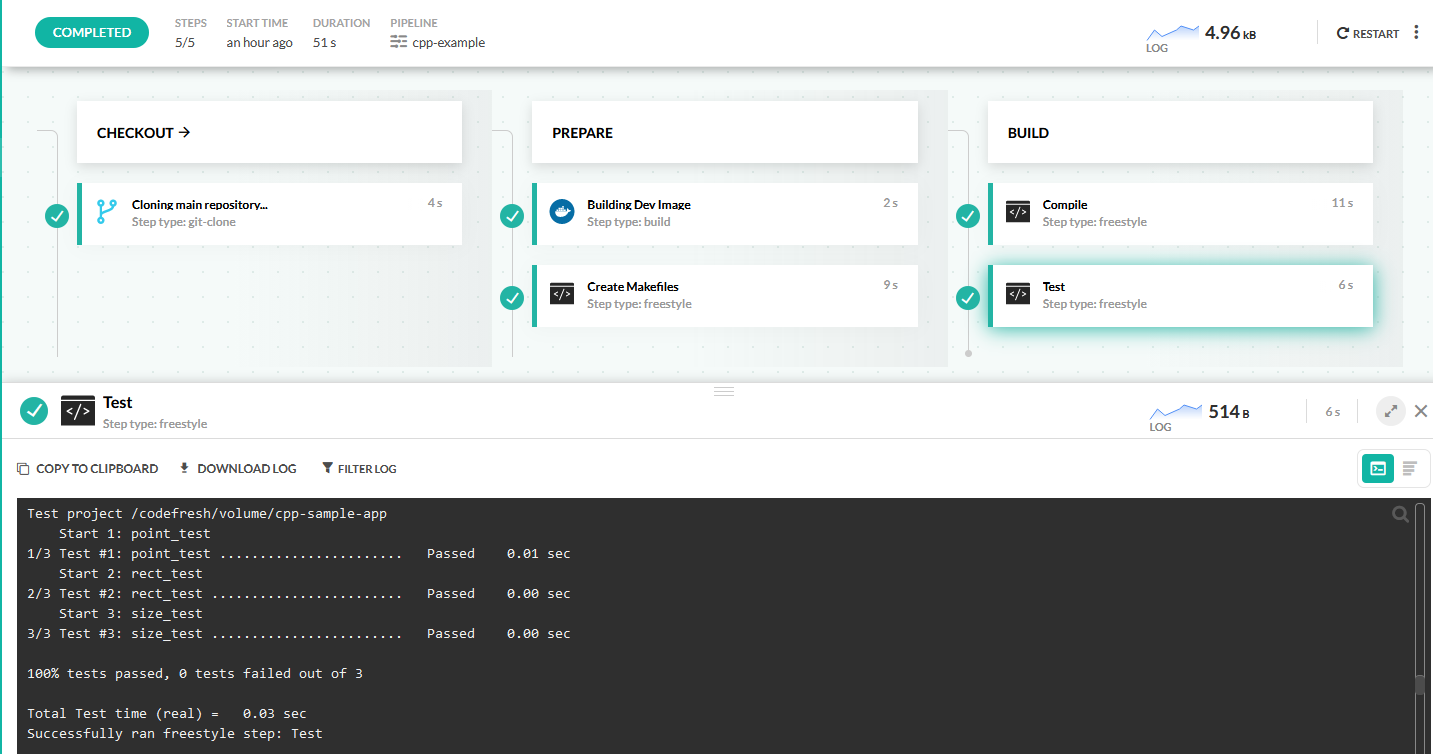 We can now use the custom Docker image in order to compile/test the C++ application: