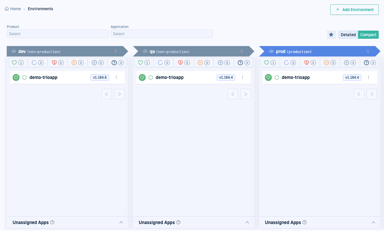demo-trioapp. - Mouse over the product name in each environment to see the associated applications. For example,
