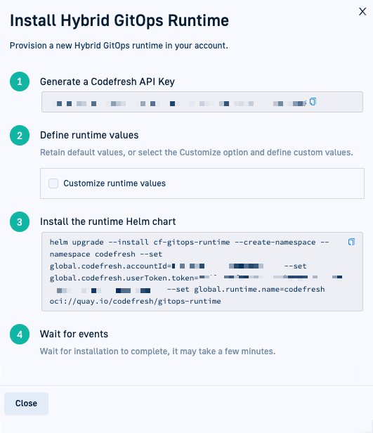 This step describes how to install the GitOps Runtime through the UI where you can copy the install command with values automatically populated by Codefresh.