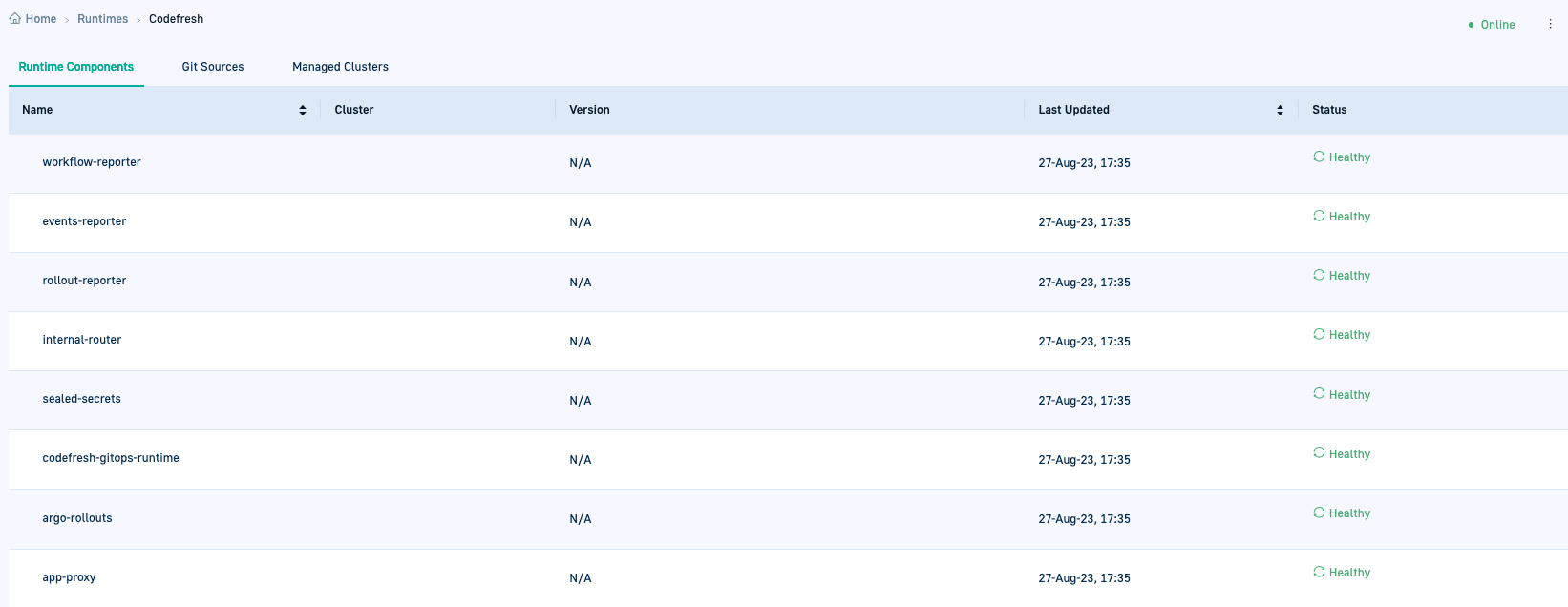 - Click Configure as Argo Application. Codefresh takes care of the configuration for you. If you drill down into the Runtime and click Runtime Components, you’ll see the list of components with their Health status.