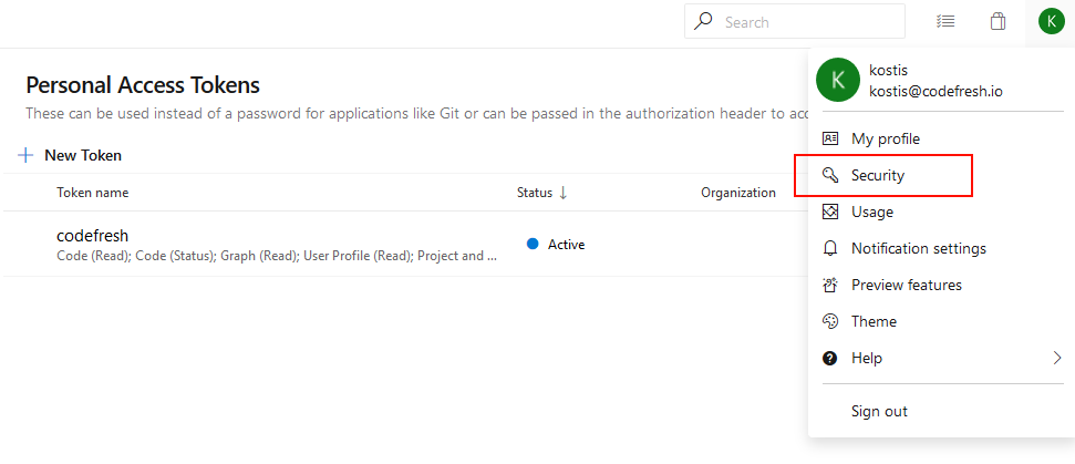 For Azure you need to create a personal access token. Sign in your Azure DevOps account and click on your profile icon on the top right corner. Then select Security: