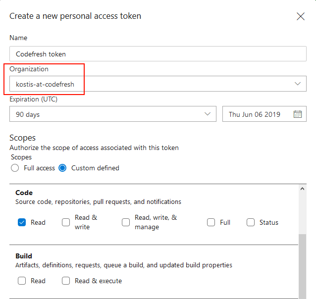 On the screen that will appear click the New token Button. Enter an arbitrary name for the token and select the correct Organization from the drop-down menu. Remember your organization name as you will use it later in the Codefresh side. Select an expiration date for your token