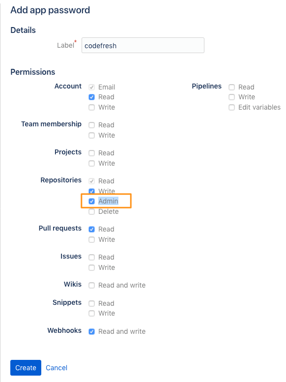 To create an application password, go to your Bitbucket settings and select App passwords from the sidebar. Click the button to create one. For more information see the Bitbucket Documentation page.