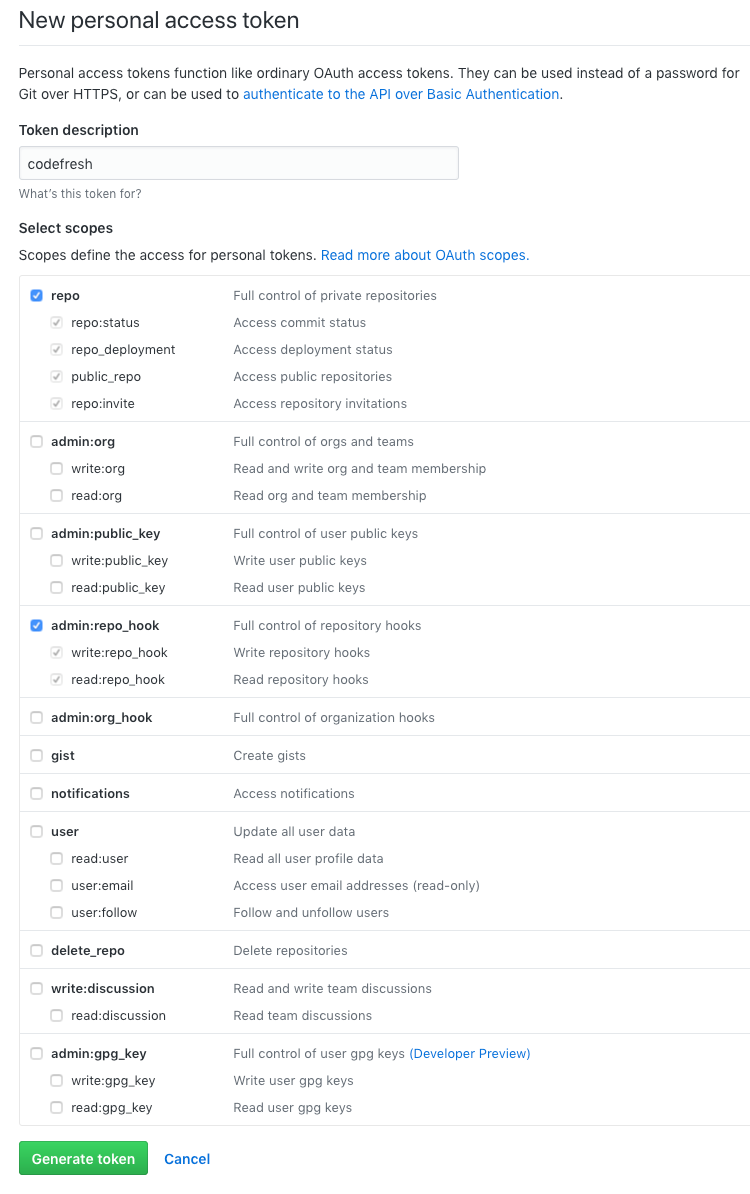 The “token description” you enter in your GitHub account in order to create the token is completely arbitrary (use “Codefresh” for an example). Once you have the token, paste it in the Codefresh UI and click Test connection. If everything is OK, you can now save the Git integration.