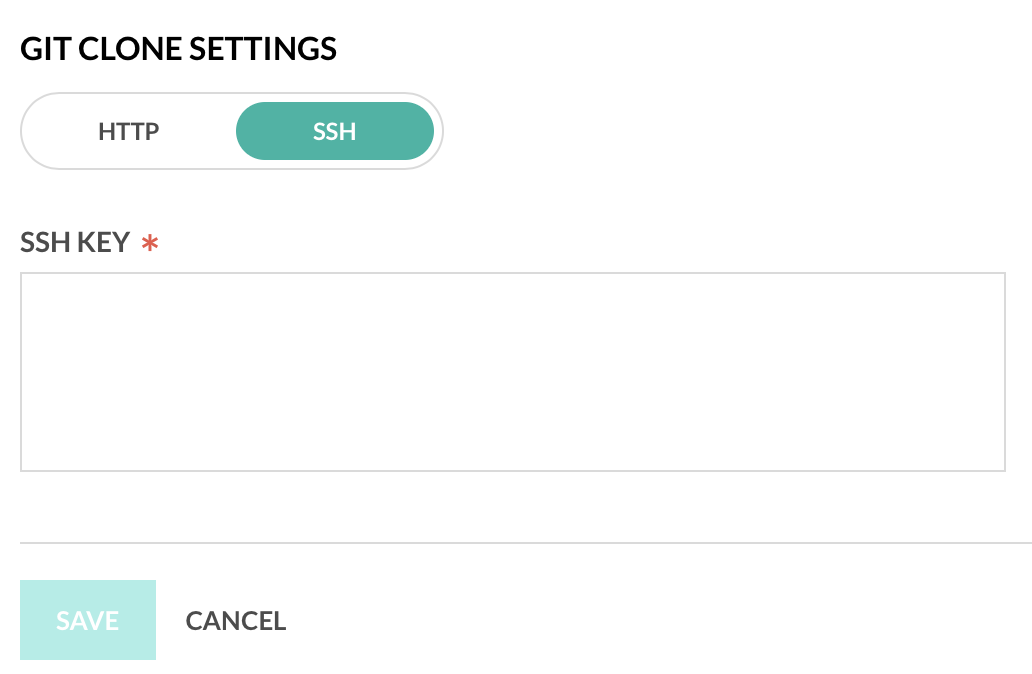 - For SSH, paste your raw, private key into the SSH Key text box and click Save.