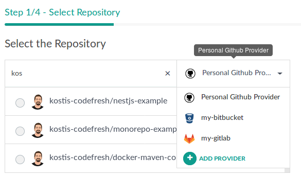 You can also add repositories from other Git providers regardless of the one you used for sign-up. For example, you can use GitLab to sign up with Codefresh, but still build repositories that exist in Bitbucket.