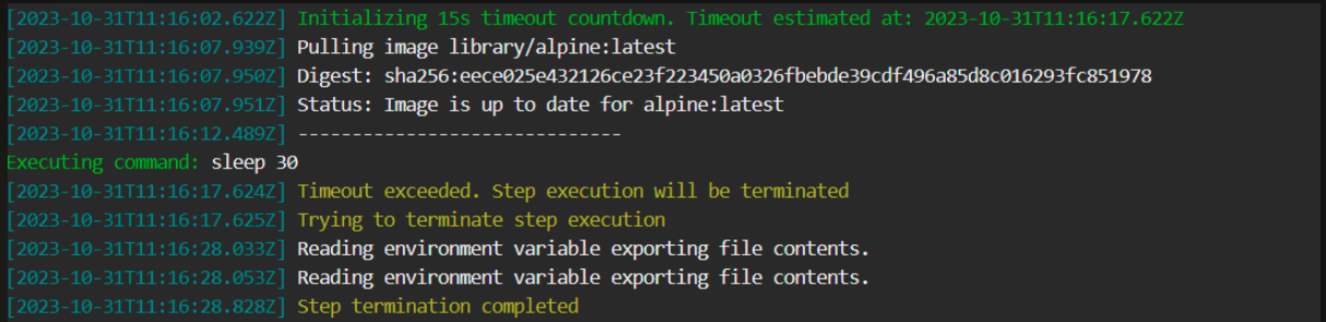 timeoutis activated at the beginning of the step, before the step pulls images. - When the step’s execution duration exceeds the duration defined for the