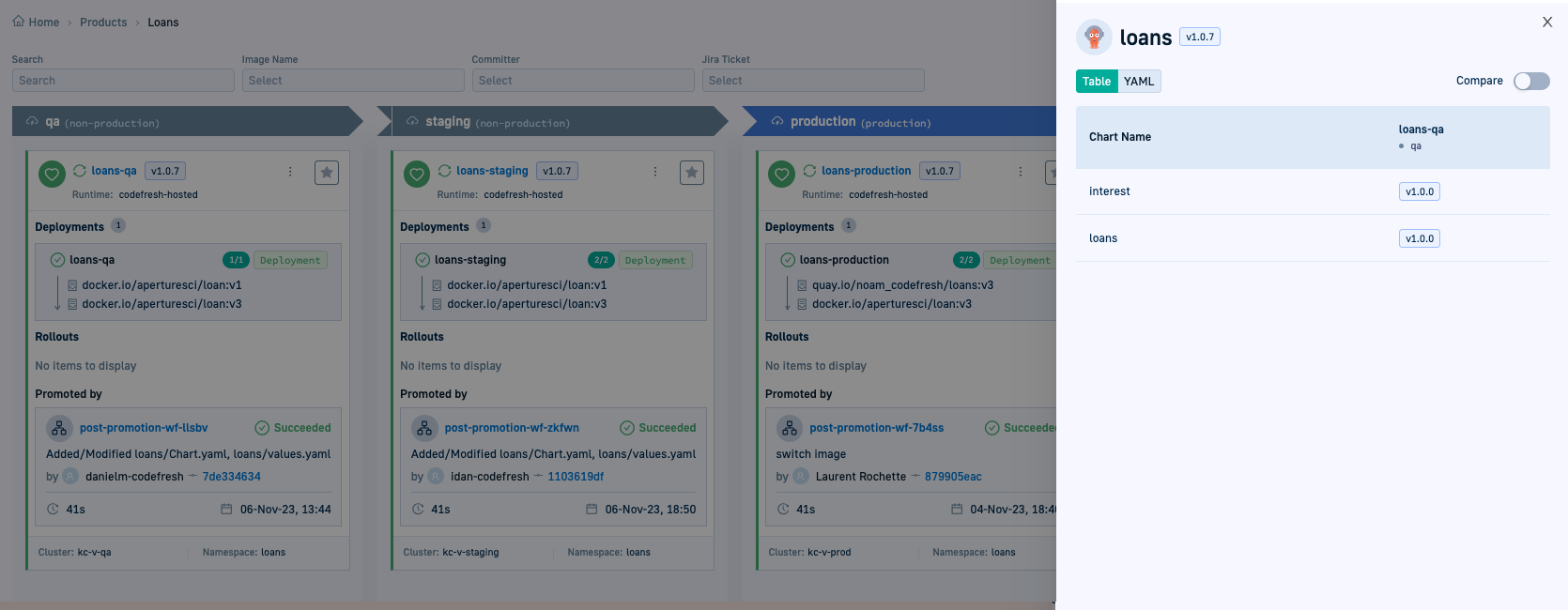- In the Codfresh UI, from the sidebar, select Environments, and then select the environment with the product or application to promote.