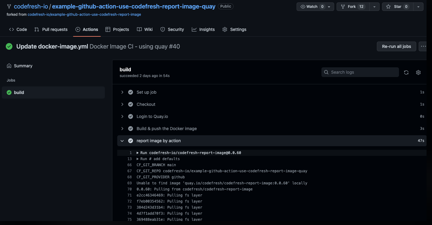 Here are examples of the build file for the GitHub Action (top) and of the Codefresh report image step in the action (down).