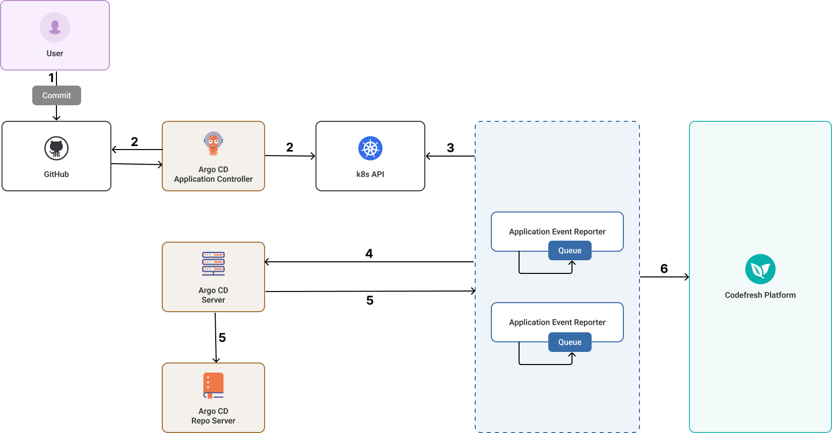 The Application Event Reporter monitors changes to Argo CD applications deployed in the cluster, and reports these changes to Codefresh.