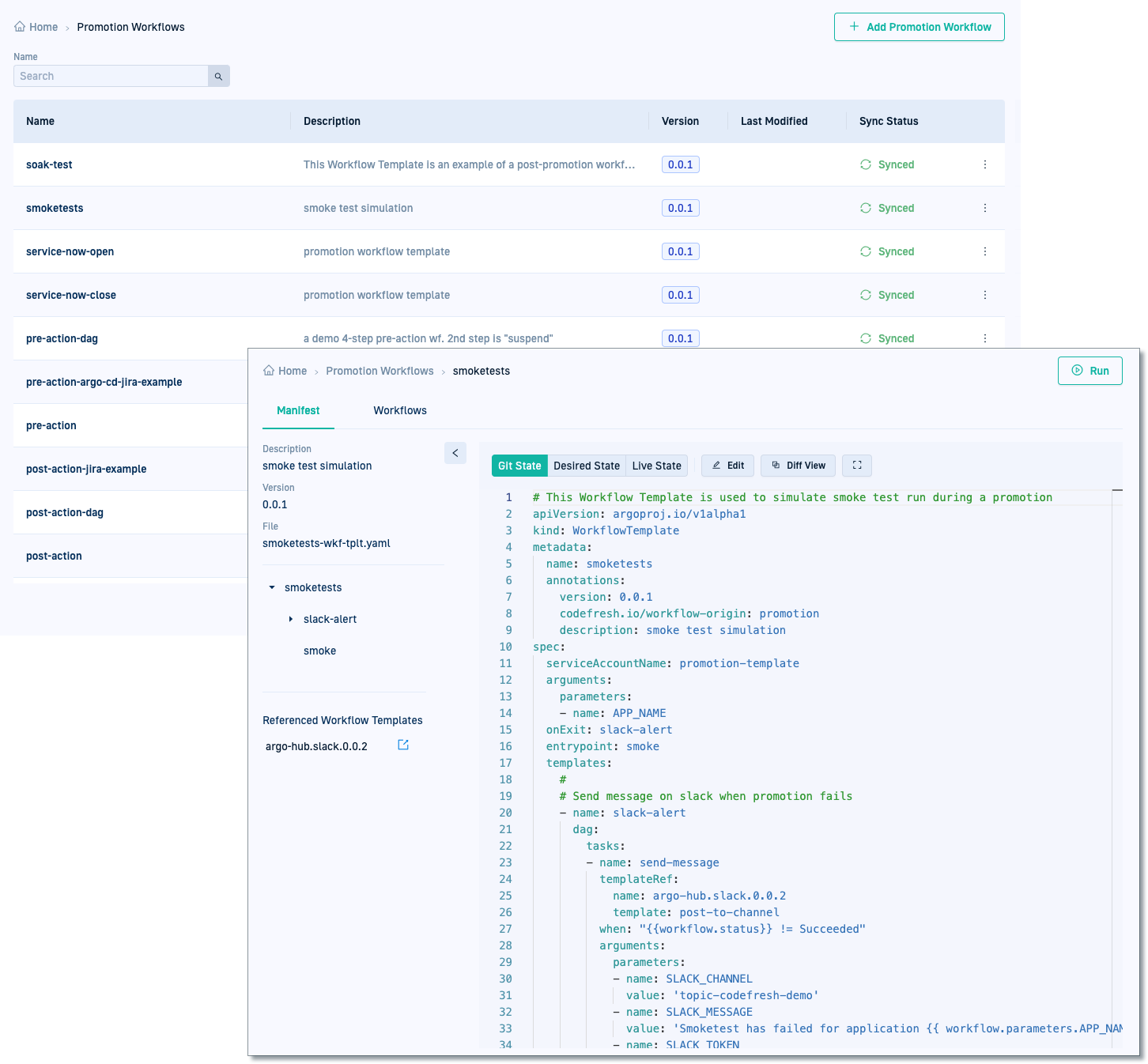 metadata.annotations.version. The version is displayed in the Promotion Workflows list in the UI. You should update it manually when there are changes. - To test the Promotion Workflow with the current settings before committing the changes, click Run.