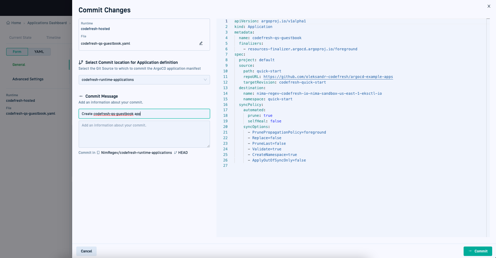 Create fully GitOps-compliant Argo CD applications directly from the GitOps Apps dashboard. When you commit the changes, Codefresh generates the application manifest and stores it in Git, ensuring a declarative, versioned, and auditable deployment process.