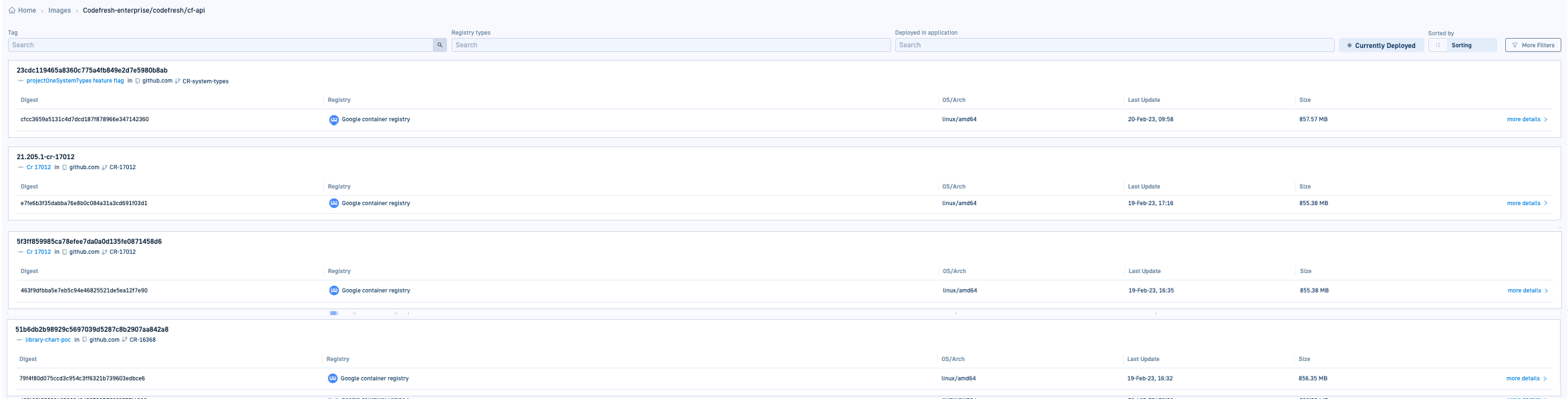 The dashboard offers a variety of filters to help quickly find relevant images. The default and most useful is the Currently Deployed filter, which pinpoints images actively deployed in applications with additional information on the tag, services, most recent commits and more.