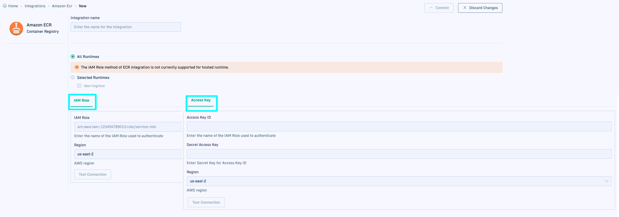 Both IAM and access key modes use AWS Identity and Access Management (IAM) to create the integration with Amazon ECR.