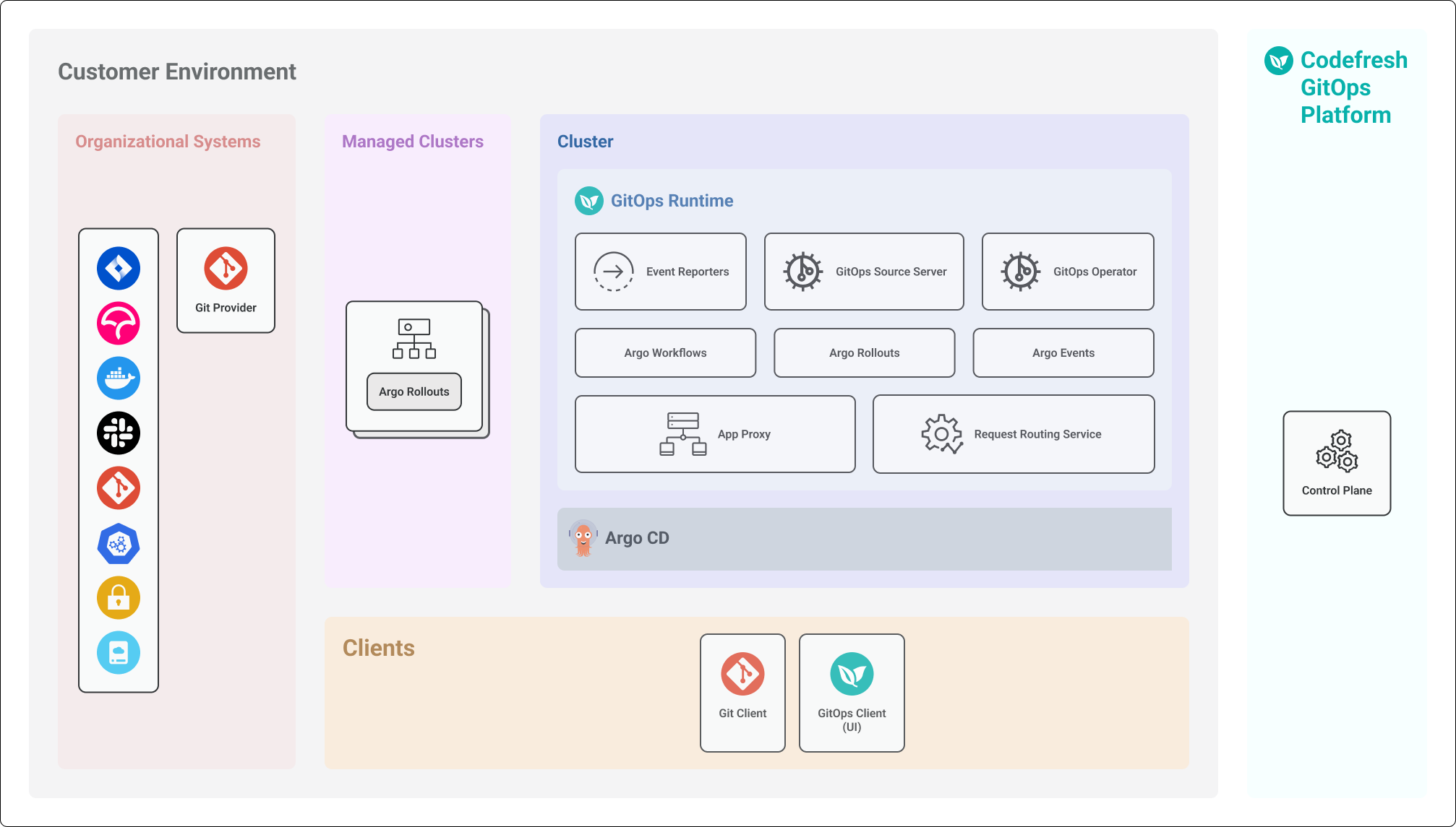 The customer environment that communicates with the GitOps Runtime and Codefresh generally includes:
