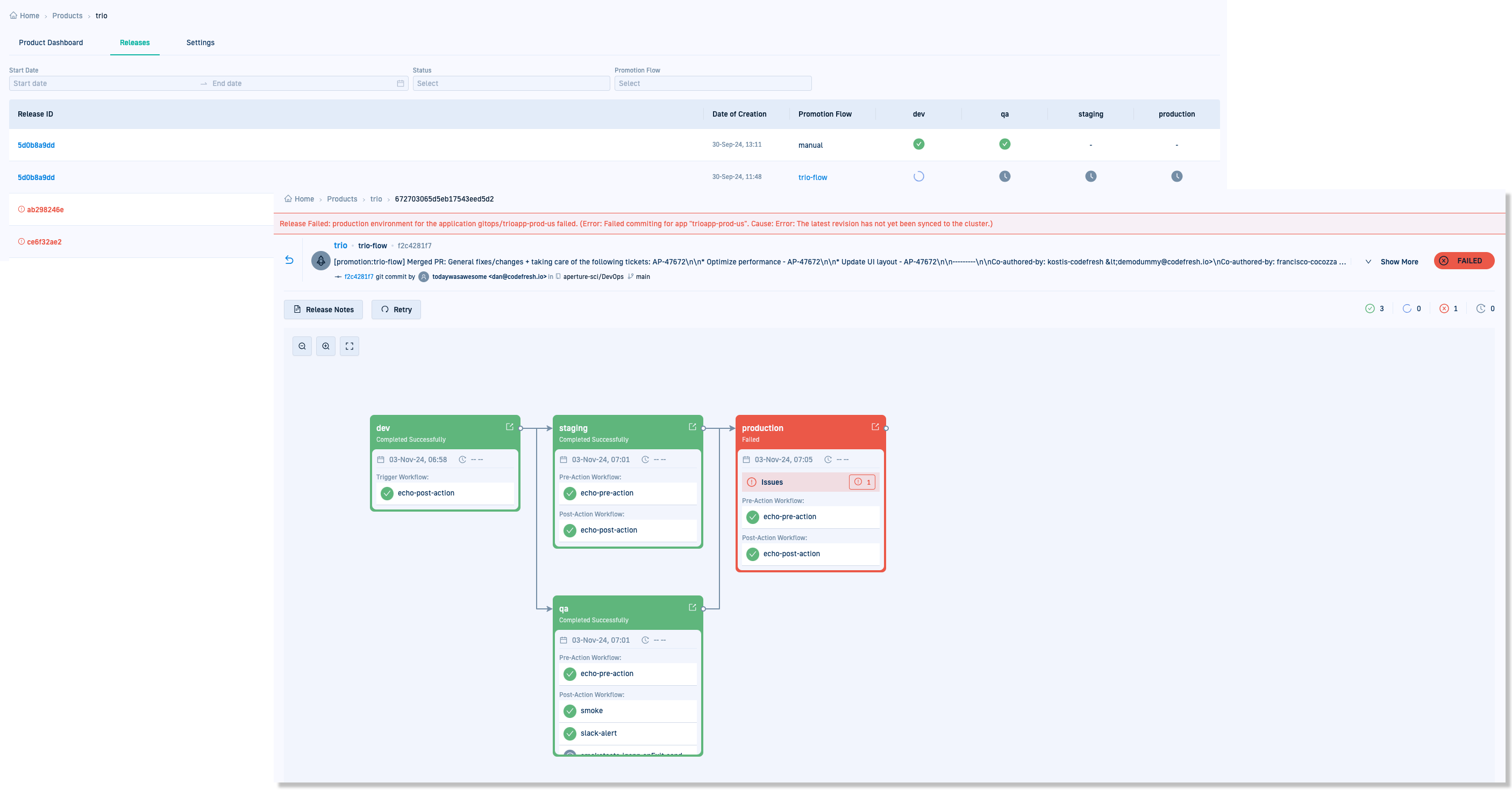 Deployment visibility Product promotions generate releases visualizing how promotions are orchestrated across environments, with insights into issue tracking, Git activity, and other actions that led to the promotion.