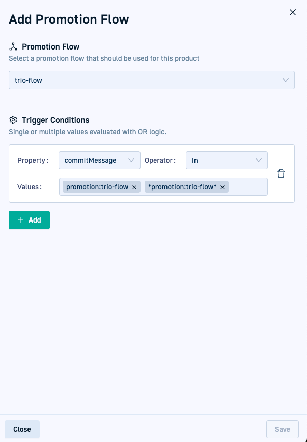 NotIn: Checks if the commit message or Git revision does not include the specified value or any value within a set of values. - Values: Single or multiple values used to match or exclude Promotion Flows based on the Property and Operator configured.