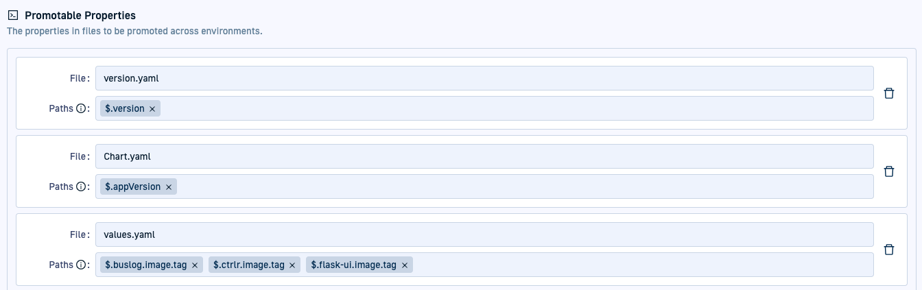 You can see that properties are configured to be promoted from three different files, with values.yaml containing multiple properties to promote.