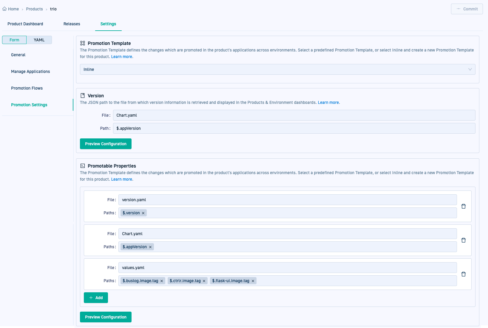 Promotion settings for products define how and when product are promoted across environments. They determine which promotion sequences are valid, the triggers that initiate them, and the exact changes that should be promoted. These settings ensure consistent, accurate, and reliable delivery of updates while aligning with your deployment strategy.