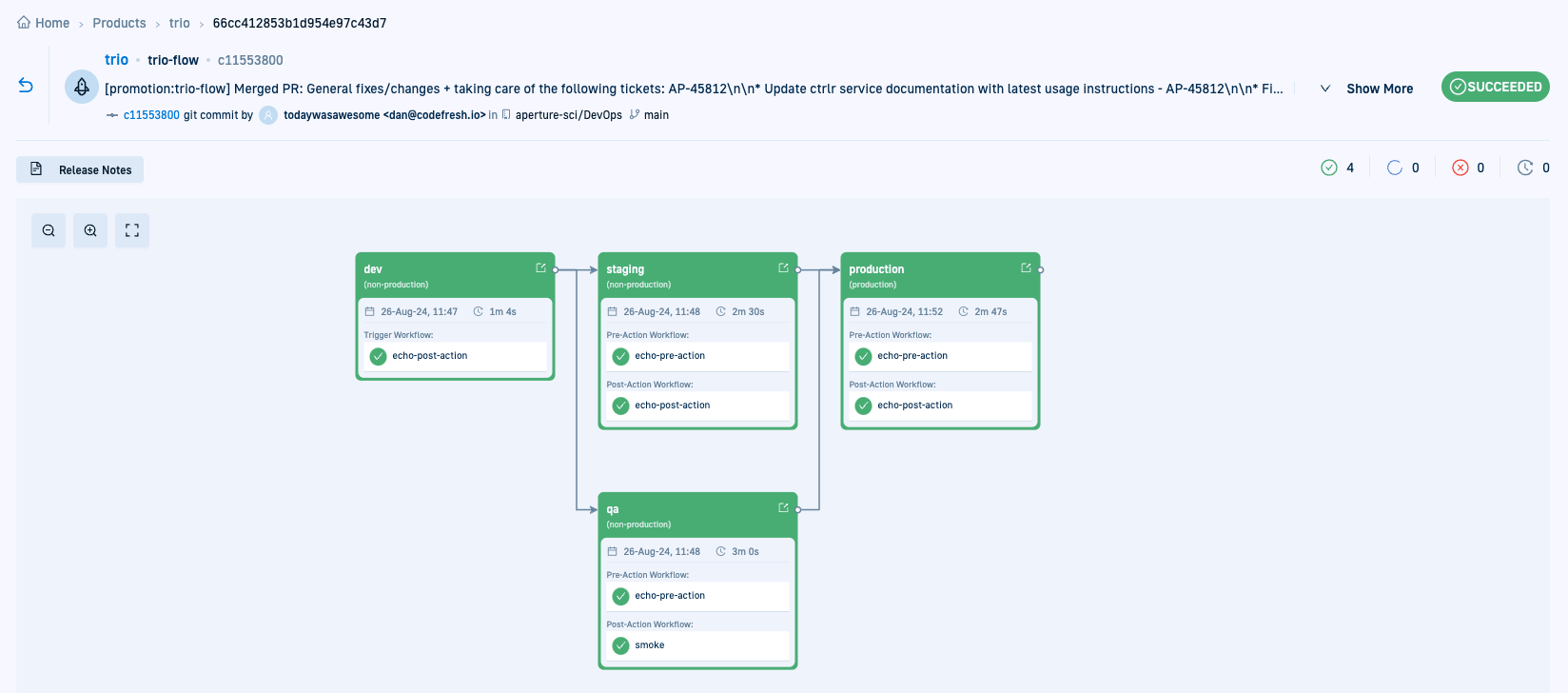 When a product is promoted manually or automatically, the promotion mechanism create a release for the product. The release provides a graphical representation of the promotion orchestration across the environments defined for it.