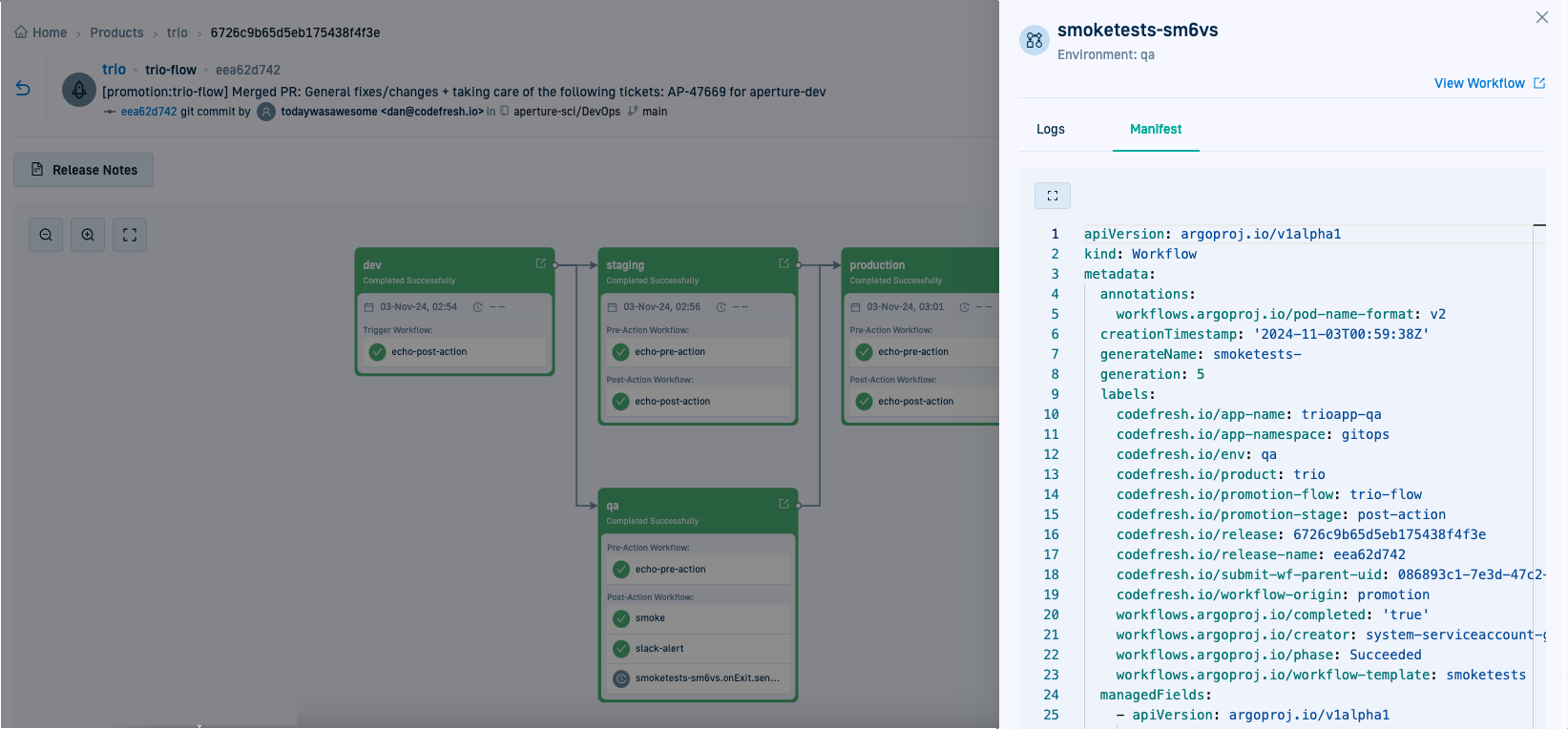 Codefresh passes arguments retrieved during the promotion process to both Pre- and Post-Action Workflows. You can use these arguments to dynamically adjust requirements throughout the promotion lifecycle.